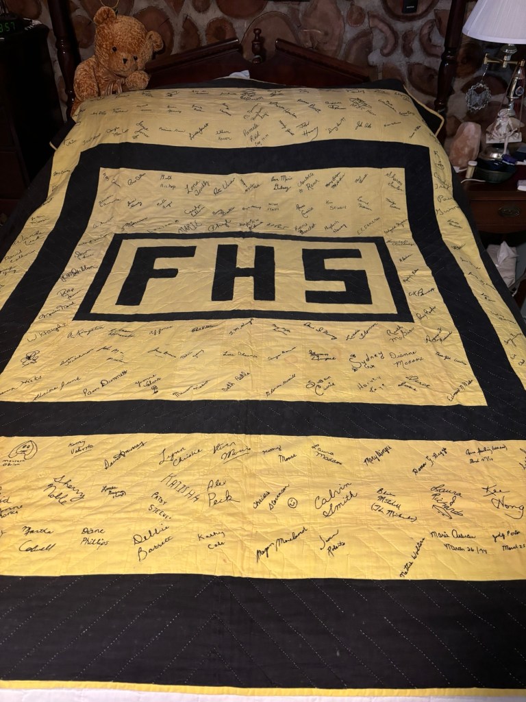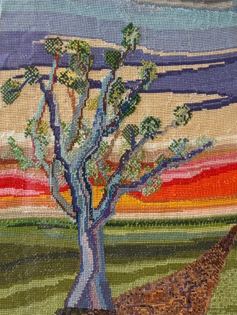 Tree at Dawn is the piece I described in my post from Nov 2023, James Webb, Palestine, “Waste Canvas”, and What We Think We Know. Done on waste canvas, because I really didn’t know what I was doing, the task was to have something to keep my hands busy, ha, ha! A piece of waste canvas that I had inherited from some friend or relative, and bits and pieces of embroidery floss that I was too cheap to toss. I love making trees, and talking to trees, for that matter. So with no pattern, what else is there to do but make a tree. It took a year to complete, and measures approximately 14×11 inches.